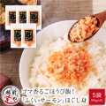 ◎ごはんにのせるだけで簡単ごほうび飯 ◎ブランド魚「ふくいサーモン」使用 ◎香ばしく焼き上げ、丁寧に手ほぐし ◎ごまの風味とやさしい甘さ ◎ご飯だけでなくいろいろな料理にも ◎常備しておけば安心・便利 福井の自然が育てた「ふくいサーモン」 「ふくいサーモン」は、豊かな自然に囲まれた 福井県内の限られた施設で育てられる ブランド養殖魚です。   名水百選に選ばれた清らかな地下水を使い、 徹底管理された環境で大切に育てられています。 脂のりがよく、臭みのない上質な味わいが特長です。 上質な素材にかける 特別なひと手間 一般的な鮭フレークとは異なり、焼き上げたサーモンを一つひとつ 丁寧に手でほぐす特別な製法で、ふっくらとした食感を実現。   香ばしいごまの風味と ほのかな甘みの味つけが、 ごはんはもちろん、幅広い料理にお使いいただけます。