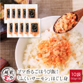 ◎ごはんにのせるだけで簡単ごほうび飯 ◎ブランド魚「ふくいサーモン」使用 ◎香ばしく焼き上げ、丁寧に手ほぐし ◎ごまの風味とやさしい甘さ ◎ご飯だけでなくいろいろな料理にも ◎常備しておけば安心・便利 福井の自然が育てた「ふくいサーモン」 「ふくいサーモン」は、豊かな自然に囲まれた 福井県内の限られた施設で育てられる ブランド養殖魚です。 名水百選に選ばれた清らかな地下水を使い、 徹底管理された環境で大切に育てられています。 脂のりがよく、臭みのない上質な味わいが特長です。 上質な素材にかける 特別なひと手間 一般的な鮭フレークとは異なり、焼き上げたサーモンを一つひとつ 丁寧に手でほぐす特別な製法で、ふっくらとした食感を実現。 香ばしいごまの風味と ほのかな甘みの味つけが、 ごはんはもちろん、幅広い料理にお使いいただけます。